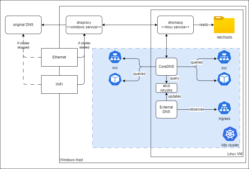 For K2s, we re-use the CoreDNS and configure ExternalDNS to sync all hosts it finds in the ingresses to the same DNS which is used to resolve the internal k8s svc host names.
